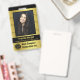 These photo ID badges have a gold-and-black colour theme. They include your employee's photo, name, and job title on the front, plus the name of the corporation / company and business logo. The back includes room for "if found" information (including address and phone number), plus space for an ID number and a bar code. The design also includes a grid pattern background and a line graph theme. Use the easy template to personalise, and then use the design tool to make more detailed changes (such as adjusting the size of the logo or barcode or deleting and rearranging elements). This eye-catching design is perfect for an office manager, administrative assistant, executive, or any business employee.