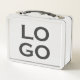 This custom classic lunch box features a solid white background with a sample company or business logo placed in the centre. You can personalise the lunch box to add your own company, organisation, or business logo, or other custom image.