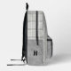 Backpack with grey grey stone textured look background. Business and promotional product. All text may be edited or removed. Professional easy to read script. Upload your logo, QR Code, or image.