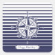 A nautical design with an ornate compass rose on blue and white stripes and a label with customisable text.