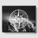 Compass star with black and white photograph of dramatic snowy mountains with milky clouds. With emblems wanderlust, nature, travel and explore that are customisable so you can write your own texts. In the centre of the star is a personalised monogram. Perfect for nature lovers hikers and travellers.
