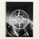 Compass star with black and white photograph of dramatic snowy mountains with milky clouds. With emblems wanderlust, nature, travel and explore that are customisable so you can write your own texts. In the centre of the star is a personalised monogram. Perfect for nature lovers hikers and travellers.