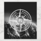 Compass star with black and white photograph of dramatic snowy mountains with milky clouds. With emblems wanderlust, nature, travel and explore that are customisable so you can write your own texts. In the centre of the star is a personalised monogram. Perfect for nature lovers hikers and travellers.