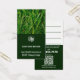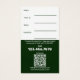 Business card size, portrait format, colors: Dark green and white