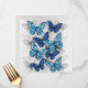 Vertical composition of realistic, blue and white morpho butterflies on grey textured background. Morpho blue butterfly.