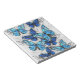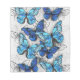 Vertical composition of realistic, blue and white morpho butterflies on grey textured background. Morpho blue butterfly.