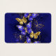 Composition of luxurious sapphire and gold jewellery butterflies on blue textured background.