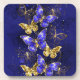 Composition of luxurious sapphire and gold jewellery butterflies on blue textured background.