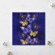 Composition of luxurious sapphire and gold jewellery butterflies on blue textured background.