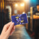 Composition of luxurious sapphire and gold jewellery butterflies on blue textured background.