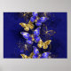 Composition of luxurious sapphire and gold jewellery butterflies on blue textured background.