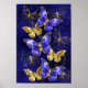 Composition of luxurious sapphire and gold jewellery butterflies on blue textured background.