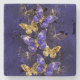 Composition of luxurious sapphire and gold jewellery butterflies on blue textured background.