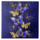 Composition of luxurious sapphire and gold jewellery butterflies on blue textured background.