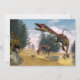 Compsognathus dinosaur hunting a gecko in a lagoon with calamite trees by day - 3D render