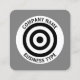 A business card template with a target like symbol made up of concentric circles. The symbol is placed in a white circle with curved text company name and business type with other contact details on the other side. Ready to be customised, suitable for a variety of businesses/uses.