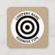 A business card template with a target like symbol made up of concentric circles. The symbol is placed in a white circle with curved text company name and business type with other contact details on the other side. Ready to be customised, suitable for a variety of businesses/uses.