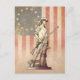 Drawing of Concord Minuteman with 13 colonies (Betsy Ross) first American flag in the background on shield shape.