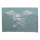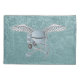Concrete mixer blue-grey with wings, pickaxe and shovel.