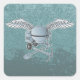 Concrete mixer blue-grey with wings, pickaxe and shovel.