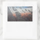 Rectangle stickers with a close up photo of condensed water drops on metal with red, white and blue reflections.