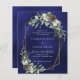 For a winter wedding. A navy blue, uneven coloured background decorated with cones, white berries and greenry. A faux gold geometric frame. Personalise and add your names and details.