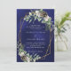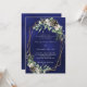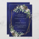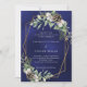 For a winter wedding. A navy blue, uneven coloured background decorated with cones, white berries and greenry. A faux gold geometric frame. Personalise and add your names and details.