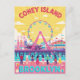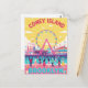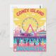 Bright, retro illustration of Coney Island, Brooklyn, featuring a large Ferris wheel and a vibrant boardwalk scene with people looking out over the water.