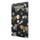 A pattern of random confetti dots in a pastel peach, maple brown and grey palette, with gold glitter on a dark background. Personalise with an initial.