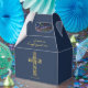 Modern confirmation favour box with a gold cross on a dark blue background and a hand lettered script name. Personalise with name, text and date.