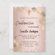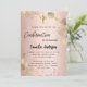 A blush, rose gold background decorated with golden eucalyptus and faux gold sparkles. Personalise and a name and ceremony details. Black coloured letters.