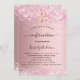 A blush pink gradient background. Decorated with pink faux glitter, confetti. Personalise and add a name and details. The name is written with a hand lettered style script