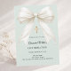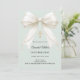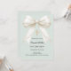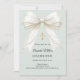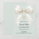 A soft pale sage green background, decorated with a large bow with pearls and a golden cross. Personalise and add a name and details details.