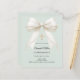 A soft pale sage green background, decorated with a large bow with pearls and a golden cross. Personalize and add a name and details details.