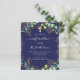 A navy blue background decorated with eucalyptus greenery and golden leaves and faux gold glitter sparkles. A golden cross. Personalise and the child's name and ceremony details.