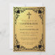 This gold confirmation invitation with a vintage air has a faux gold foil background and an ornate frame with elegant baroque decorations. Above the text there is a religious cross. The text, the cross and the frame are black. All text can be personalised.