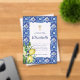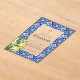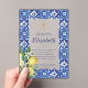 Composed of serif and cursive script typography. All against a backdrop of blue and white Mediterranean Spanish tiles with greenery foliage leaves, lemons and wild floral flower botanicals.