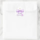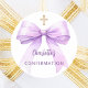 A white background. Decorated with a large lavender bow and a golden cross. Personalise and add the name.