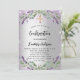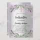 A modern, stylish and glamourous invitation for a Confirmation, A faux silver looking background with violet faux glitter, sparkles, lavender florals, flowers and eucalyptus greenery. The name is written with a modern hand lettered style script. Personalise and add your details.