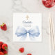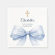 A white background color. Decorated with a large light blue colored bow and a golden cross. Personalize and add the name and date.