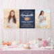Add a personalised touch to college or high school graduation party decorations with this navy blue, copper and white custom photo banner. Design features a dark blue ombre background, faux foil mortar board cap, stylish modern typography, hand written style script calligraphy, and 2 photos of the graduate, such as senior pictures or images from the commencement ceremony. Please note that copper is printed colour, not metallic foil. This party sign is an elegant way to celebrate the special day. Congratulations to the graduate!