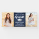 Add a personalized touch to college or high school graduation party decorations with this navy blue, white and silver custom photo banner. Design features a faux brushed stainless steel mortar board, stylish modern typography, hand written style script calligraphy, and 2 photos of the graduate, such as senior pictures or images from the commencement ceremony. Please note that silver is gray printed color, not metallic foil. This party sign is an elegant way to celebrate the special day. Congratulations to the graduate!