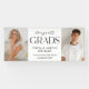 Minimalistic double graduation party welcome sign features "Congrats Grads" in modern script and serif type styles with 2 individual photos of your twin grads, along with their names, school and class year. Stylish and minimal black and white design can be fully customized.