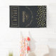 Congrats Graduate party banner with gold coloured circles / confetti. A gold coloured illustration on a black-grey background. Designed with an illustration of a mountain with the suns rays shining outward from behind. Typography says: Good Luck on your next Adventure explore dream discover.