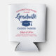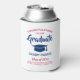 Add a personalised touch to college or high school graduation party decorations with red, white and blue can coolers. Design features a white background, blue mortar board cap, stylish modern typography, handwritten style script calligraphy, and a customisable message reading "Congratulations to our Graduate". Text at the bottom includes class year, school name, and an optional line for degree, honours, or other info. All text is simple to customise. These elegant favours make a stylish graduation celebration drink idea. Cheers!