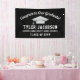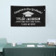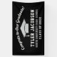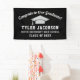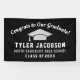 Congratulate your graduate in style with a modern personalised graduation banner sign, featuring with gold coloured grad cap, and sporty custom text for the grad's name, school, and class year. Black, silver, and white colours can be customised to match your party colours.