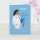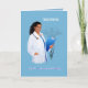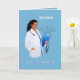decorated this card with artwork that I painted digital in Photoshop. The figure is realistic but with a contemporary style. I used a blue background with the medical symbol to support the portrait. The card has the clean and professional look that fittest perfect for such a noble ceremony.
