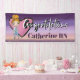 Modern congratulations sign for features a cute nurse who has graduated from nursing school. She has a big heart and enjoys caring for others. Typography style fonts. Monogrammed with graduates name. Purples, pinks, black and blue colours. Faux gold glitter look. Congrats to the new RN Registered Nurse.