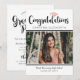 Stylish and elegant photo graduation announcement and party invitation features "Congratulations" in a trendy calligraphy script font with rose gold / blush pink coloured grad cap motif and a landscape photo of the grad. Personalise the modern custom text and a two-sided design for the open house details. Simple and minimalistic black and white design with rose gold coloured accents.