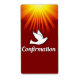 A flying dove on a red and gold rays is beside the information of a Confirmation. Wonderful Congratulations gift or party suppy to anyone getting confirmed on their special religious event.